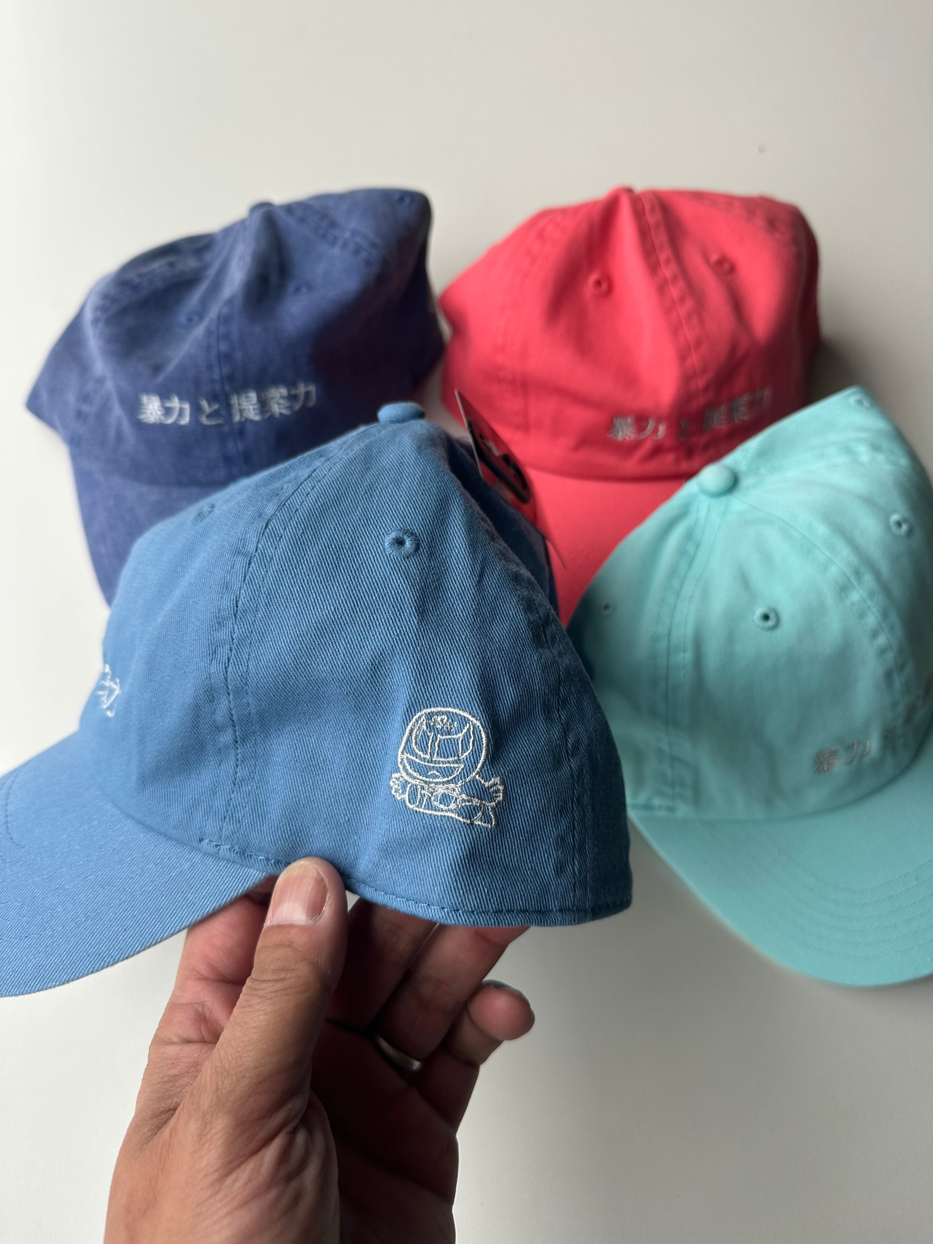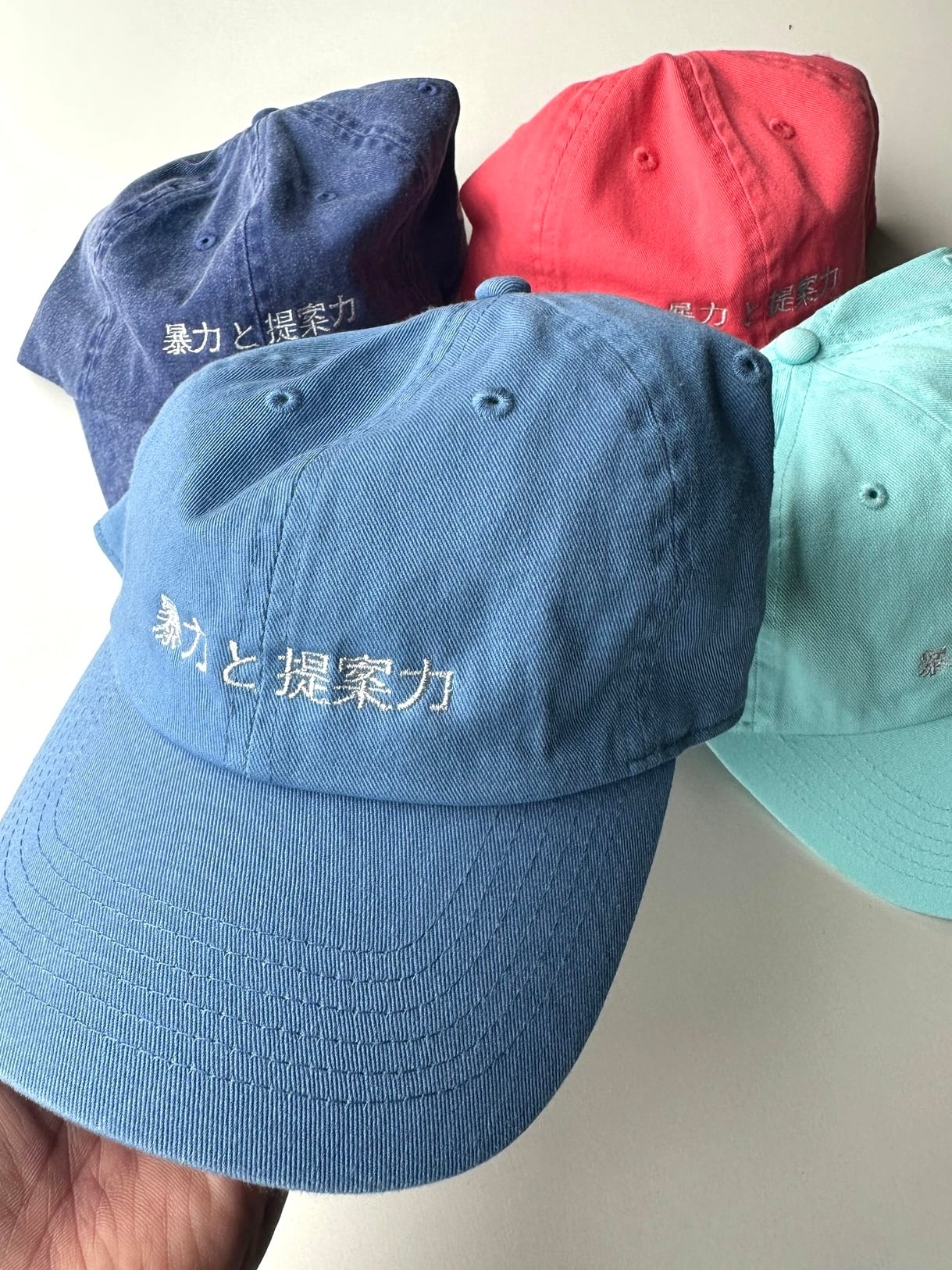 刺繍キャップが通販サイトに入荷します。キャップに刺繍で縫い込んだのは、ササダンゴ商会の社是「暴力と提案力」という文字。そして、定番マークの「顔出し小僧」です。